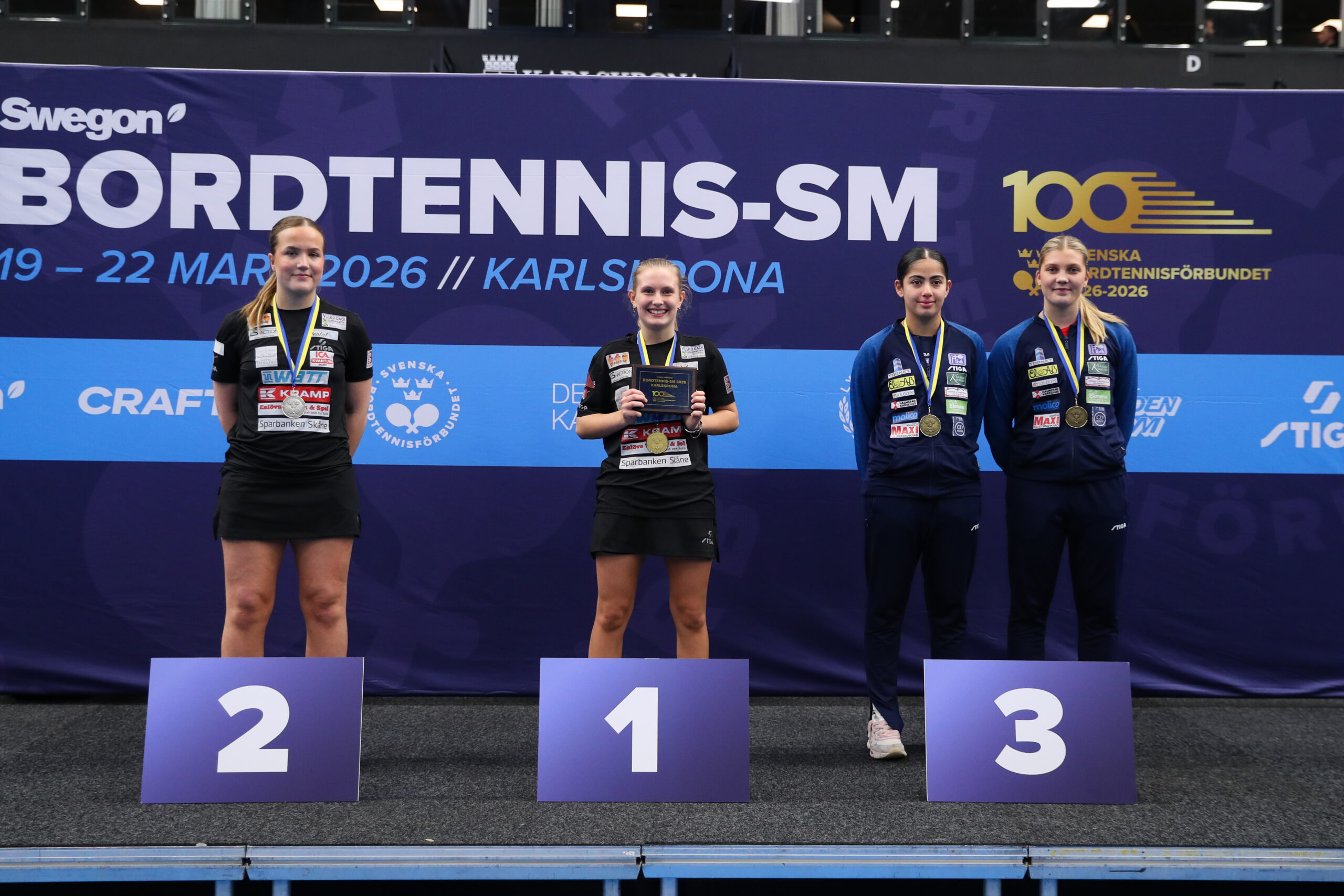 Bild: Prispallen i damer 20 på Swegon Bordtennis-SM 2026 Foto: Linda Carlsson